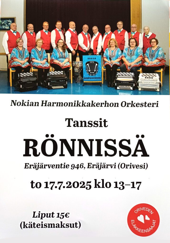 Oriveden Eläkkeensaajat järjestää Rönnin lavalla päivätanssit torstaina 17.7. klo 13–17.